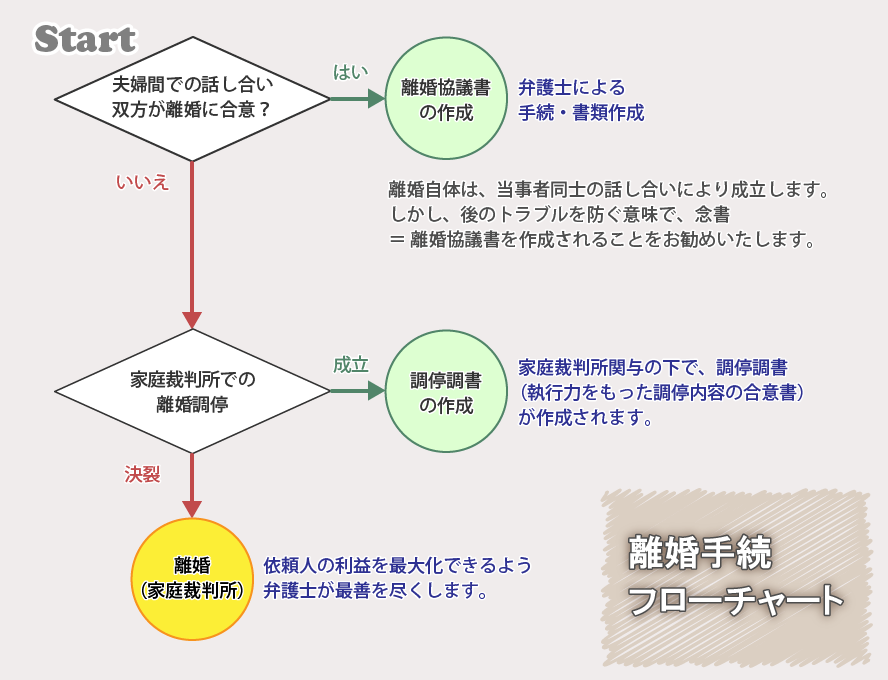 裁判や調停になった場合、「離婚できるのか」、「損害賠償を請求できるのか」と言った法律的なアドバイスを通じて、あなたの苦痛をやわらげるお手伝いをいたします。